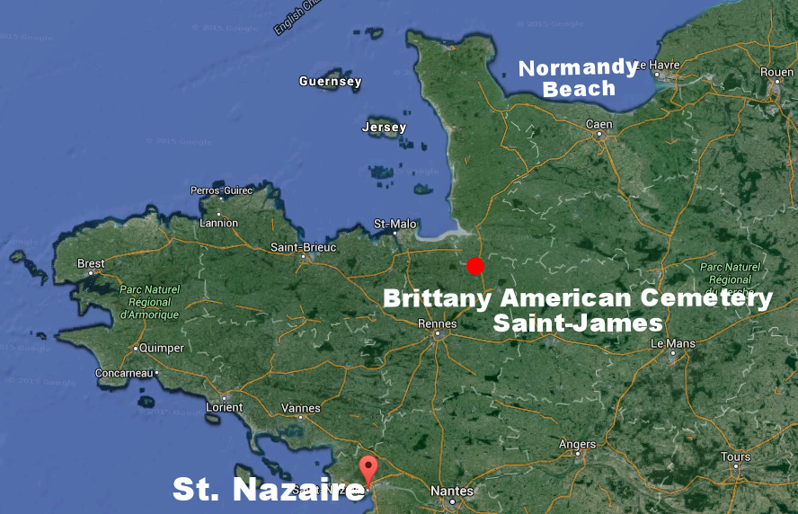 This was rough work with lots of close skirmishes. I heard a story about Kenneth that he would hide by the road and when a tank rolled by he would run up and drop in a grenade and then run away. He fought bravely, but died in battle on October 22, 1944, less than 2 months after arriving in France. He is buried in the Brittany National Cemetery in Saint-James. We toured Normandy Cemetery on Omaha Beach, then the next day drove to the Brittany Cemetery and had a wonderful experience, visiting his gravesite and talking to the superintendent where I obtained a lot of this information. They told us all about what his unit did in the war, escorted us to his grave, showed us how the gravestone is presented (with sand from Omaha Beach) and even played "Taps" through the loudspeakers at the cemetery.